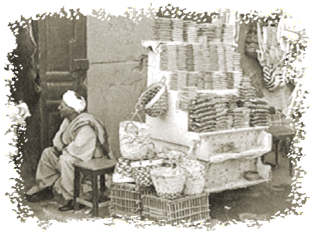 Ein Gewürzhändler wartet auf Kundschaft für sein reichhaltiges Angebot